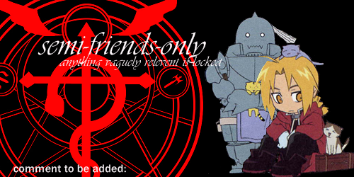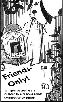 Though I must admit, I was rather scared for a moment when I thought you might have lost all my userpics. But non, here you are! Back and in one piece, as far as I can see. And now I've posted the things that have been sitting on my computer since you went down yesterday. And now I can sit here and finally do that little bit of random that I intended to do yesterday... it's tough choosing between my two friends-only banners, but I think I'll go with the second because it's cuter and fits the theme better. This is necessary in so many ways. People I know in real life who occasionally read this but don't have LJs... freaking get one. Or deal with it. Hehehe.